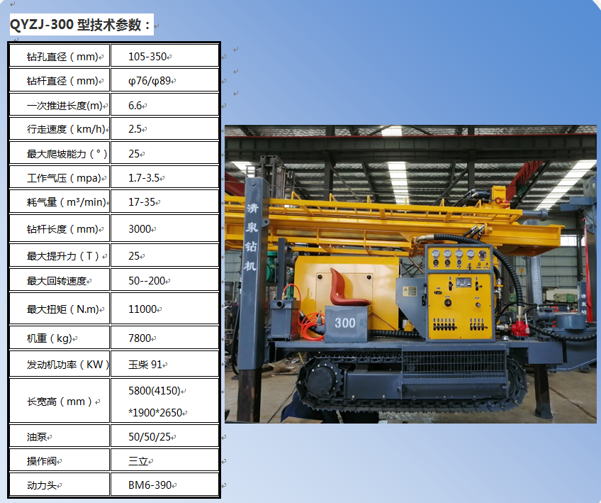 清泉300型潛孔水井鉆機(jī) 發(fā)動(dòng)機(jī)功率:玉柴92千瓦。 油泵:美國(guó)泊姆克三聯(lián)泵 動(dòng)力頭馬達(dá): BM6-390。 最大扭矩: 11000扭米。 最大提升力: 25噸v 操作閥:三立。 整機(jī)機(jī)重: 7. 8噸。 尺寸:長(zhǎng)5.8米(底長(zhǎng)4.15米),寬1.85米,高2.35米。 鉆孔直徑: 105-350 毫米。 鉆桿直徑:φ76/φ89毫米(3米)。 一次性推進(jìn)長(zhǎng)度: 6600 毫米